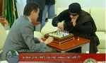 Tikmēr Lībijas Kadafi savā valsts televīzijā pozē pie šaha galdiņa.