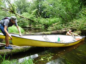 Aiz katra otrā līkuma bija kāds bomis, stumbrs, krituši zari vai celmi, kas nosprostoja ceļu un sarežģīja dzīvi. Žonglējām, gūlāmies guļus laivā zem platiem stumbriem, stūrējām, aizairējām kamēr pārvēlāmies aizsprostojumiem pāri.