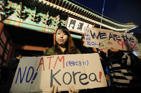 Protestētāji pulcējās iepretī Valsts bankai un skandēja saukļus – ”pakariet bankas šefus viņu bonusu izpletņos, kas viņiem vienmēr dāsni pienākas!” ; ” Kas mēs īsti esam? Mēs esam visi, visi, visi!; ” Ko viņi dara ar mūsu naudu – pievāc, pievāc, pievāc sev!”