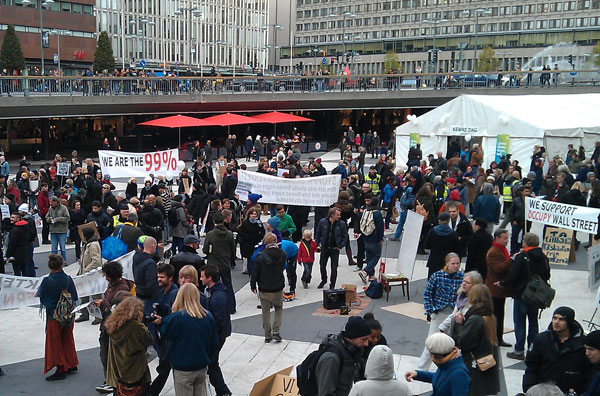 Vairāki simti, dažāda vecuma cilvēku šodien pulcējās Stokholmas centrā, lai piedalītos globālajā protesta kustībā pret finanšu pasaules alkatību ar nosaukumu ”Occupy Stockholm”.
