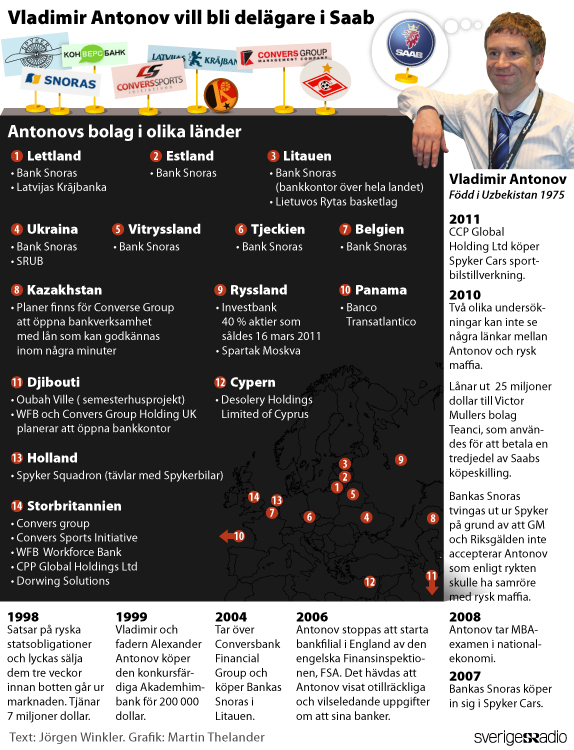 Vladimirs Antonovs zviedriem ir krievu banķieris, bijušais Spyker akciju līdzīpašnieks. Brīdī, kad Spyker vēlējas iegādāties SAAB akcijas, General Motors iebilda pret Antonovu kā nākamo autokoncerna līdzīpašnieku. Slepena informācija liecināja, ka viņš saistīts ar Krievijas ekonomisko noziedzību. Pats Antonovs ”apvainojumus” noliedz un apgalvo, ka joprojām esot Spyker akciju īpašnieks (ar sava uzņēmuma CPP starpniecību) un šo ceļu viņš turpināšot pārņemot savā kontrolē arī SAAB Automobile akcijas.