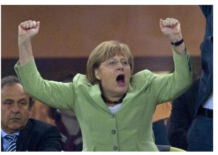 Attēlos var redzēt ka Merkele nevarēja savaldīties un sajūsma, ka Vācija sakāva Grieķiju, izlauzās uz āru šādā veidā: