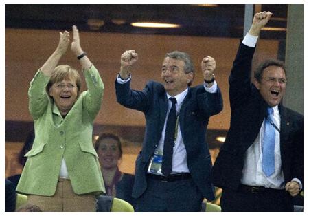 Šoreiz žurnālistiem interesantāk bija vērot nevis to, kas notika laukumā, bet kas notika VIP ložās. Kā uz spēli reaģēja Vācijas kanclere Angela Merkele. Jo pirms spēles mediju aprindās tika apspriests, ka Merkele būs spiesta pieturēt savas emocijas, lai nekacinātu jau tā ļoti negatīvi pret Vāciju noskaņotos grieķus, kuri uzskata, ka pie viņu ekonomiskās krīzes ir vainīga Vācija, kuru nereti grieķi salīdzina pat ar Hitleru, jo Merkele stingri prasa Grieķijai ievērot taupības režīmu, lai pretim saņemtu vāciešu nodokļu maksātāju naudu.