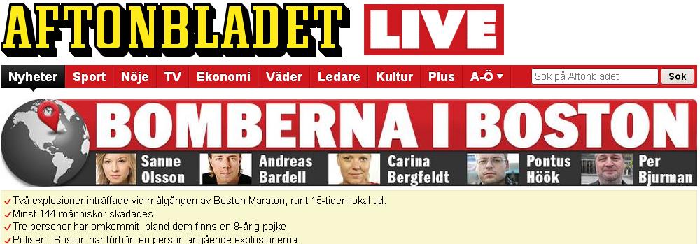 Saites uz zviedru svarīgāko mediju mājas lapām, kur var labi redzēt šo mediju darbu Bostonas traģēdijas atspoguļošanā:
