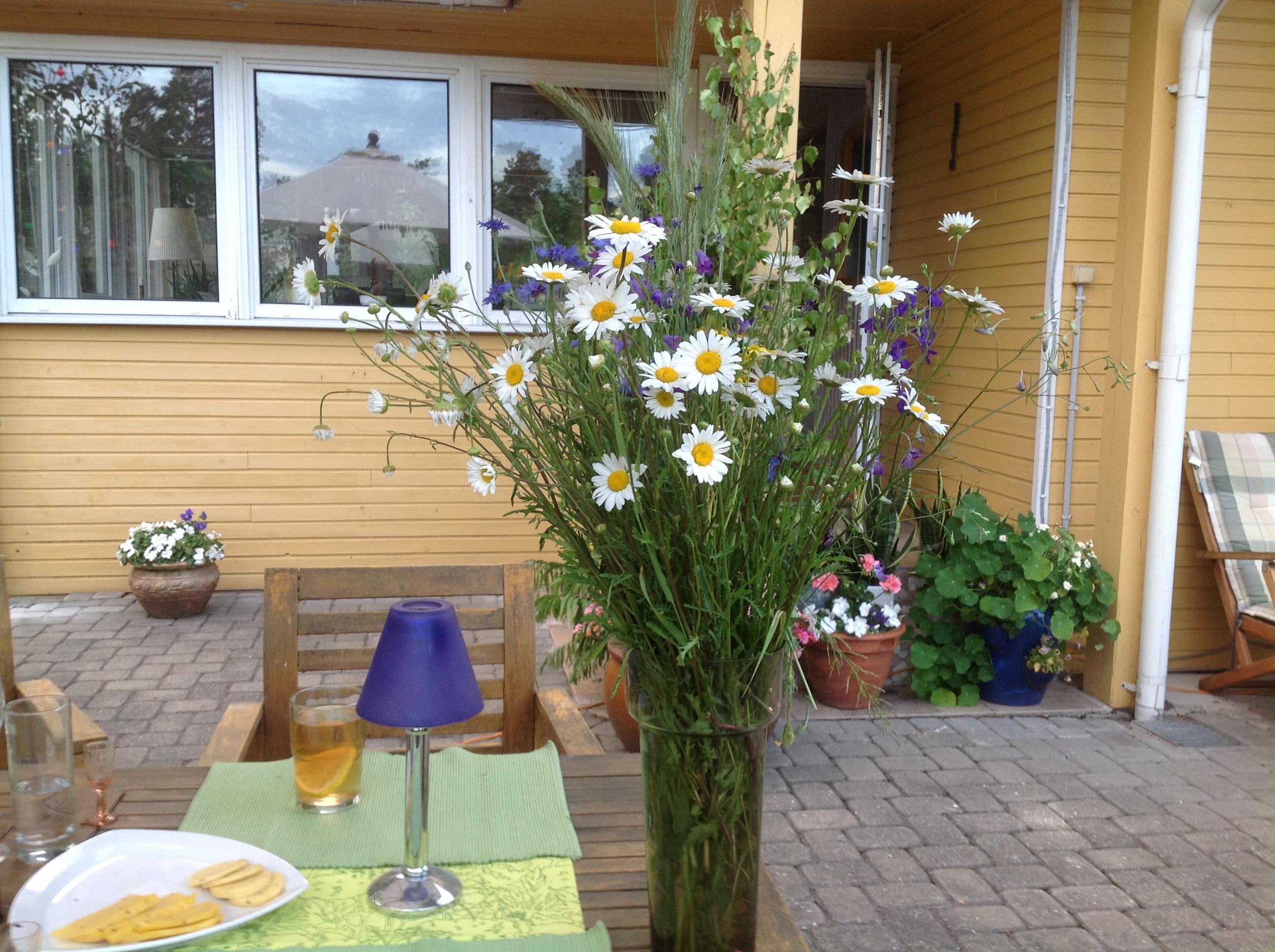 Pa dienu izpušķojām visas durvis, grābām mauriņus, sagādājām svētku maltīti ar zemenēm un pirms tam devāmies īsā pastaigā uz Brīvdabas muzeju. Tur Līgosvētki jau bija sagaidīti (apmēram nedēļu iepriekš) un meijas pie Kurzemes sētas vārtiem izskatījās savītušas un nogurušas no karstuma. Divas ģimenes dalīja dāvanas bērniem (kā Ziemassvētkos) un ”Jānis” (bez bārdas un sarkanā kažoka) pieprasīja mazuļiem dziedāt un dejot pirms iesaiņoto kārbiņu saņemšanas. Saulgriežu tradīcijas, tātad, sintezējas. Nebrīnīšos, ka pavisam drīz ziemas saulgriežos ”kāds” pie eglītes sāks dziedāt ”līgo, līgo” un tas nemaz nebūs slikti.