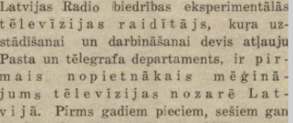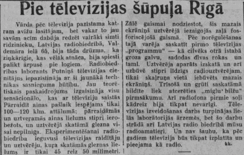 Pirms astoņdesmit gadiem „Radio Abonements“ un „Jaunākās Ziņas“ informēja par to, ka 1937. gada 10. novembrī Rīgā pirmo reizi demonstrēta “tēlevīzija”. Latvijas Radio biedrība bija ieguvusi tiem laikiem modernu televīzijas raidītāju, kas “devis 45 x 50 mm” lielu attēlu.