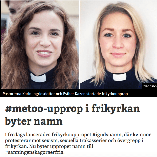 Aizvadītajā nedēļā #metoo kustībai pievienojās arī zviedru brīvbaznīcas pārstāvji. Iniciatīvas avangradā – divas mācītājas no Evanģēlistu un Vasarsvētku draudzēm. Kā aicinājumu šeit izmanto jēdzienu #patiesībajūsatbrīvos (#sanningenskagoraerfria), kas lūdz ziņot par pāridarījumiem baznīcas hierarhijā. Pašlaik aicinājumu jau parakstījuši 436 draudžu locekļi. Kā norāda kristīgā avīze Dagen, atsaucība šajā virzienā esot bijusi daudz aktīvāka nekā sakumā tika prognozēts. Iniciatīvas autores Estere Kazena un Karina Ingridsdotira uzsver, ka parakstu vākšanas procesā iesaistoties praktiski visi: sākot no pusaudžiem un beidzot ar astoņdesmit gadus veciem sirmgalvjiem. Par ko sūdzas? Par to, ka draudzēs (tieši tāpat kā sabiedrībā kopumā) eksistē maskulīnās iniciatīvas kults: apgrābstīt meitenes un sievietes, izteikt piezīmes un uzmākties arī pēc tam, kad saņemts noraidījums. Mācītāji šos pārkāpumus neuztver nopietni un neizsaka uzbrucējiem nosodījumu. Iemesls ir draudzes nevēlēšanas, lai šādas “nejaukas lietas” nonāktu ārpus baznīcas sienām. Tas kompromitētu ticīgos un pašu baznīcu. Tāpēc sieviešu un zēnu tvarstīšana turpinās kā norma, ar kuru “vājajam” nākas samierināties. Tas, ka arī baznīcas cilvēki ir saņēmušies iztīrīt savu sabiedrību no šīm nejēdzībām ir liels solis uz priekšu. Nevis nedēļas, bet gadsimtu notikums. Paldies! Lai izdodas.