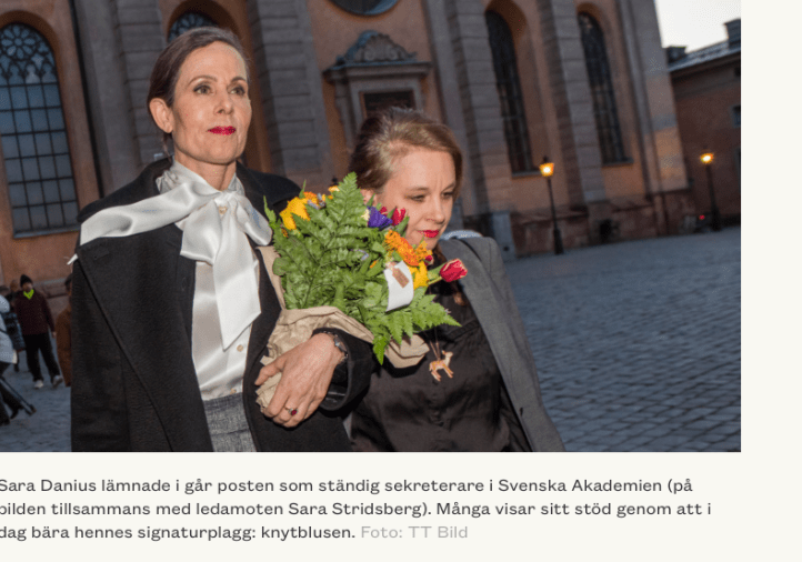 - – Šī blūze izaicina večus – dinozaurus”, – raksta žurnālists Arne Rūts vakardienas Dagens Nyheter. Senā Zviedrijas Akadēmijā, kuru dibināja karalis pirms 200 gadiem, ir valsts valstī. Līdz šim tajā tika ievēlēti (ar retiem izņēmumiem) tikai un vienīgi kungi. Viņi arī piešķīra prēmijas un balvas. Pirms 20 gadiem kungu rindas tika paretinātas un Akadēmijā iekļuva vairāk sieviešu. Viena no viņām (dzejniece Katarina Frostenson) tika ievēlēta 90. gadu sākumā un iesaistīja akadēmijas aktivitātēs arī savu vīru Žanu Klodu (francūzi). Viņš dibināja kultūras klubu, izmantojot akadēmijas finansējumu, un nepalaida garām iespēju seksuāli izmantot jaunās mākslinieces. Tās pašas, kas pretendēja uz koncertiem un izstādēm šajā klubā. Tagad noskaidrojās, ka šādu – seksuāli izmantotu sieviešu dzejnieces vīra kolekcijā ir ap 20-30. Laikraksts Dagens Nyheter (kustības me-too ietvaros) atklāja šo faktu, kas kuluāros jau faktiski bija zināms. Sabiedrībā sākās viļņošanās, bet Akadēmijā nerīkojās. Akadēmijas patrons karalis arī klusēja un Žans Klods apvainojumus noliedza. Visbeidzot sākās šūpošanās un vairāki kungi izstājās no akadēmijas, pieprasot Katarīnas Frostensones izslēgšanu. Publiskajā telpā vīdēja viedoklis, ka sieva nav vainīga pie vīra izlaidības un Katarīnu izslēgt nevajadzētu. Finālā no Zviedrijas Akadēmijas tika izraidītas divas sievietes no kurām viena bija sekretāre Sāra. Tā pati, kas nēsā konservatīvi klasisko blūzi „ar šleipi”. Viņai tika pārmests rīcības nespēja un vairāki Akadēmijas locekļi neslēpa savu nepatiku pret sievieti šajā augstajā amatā.