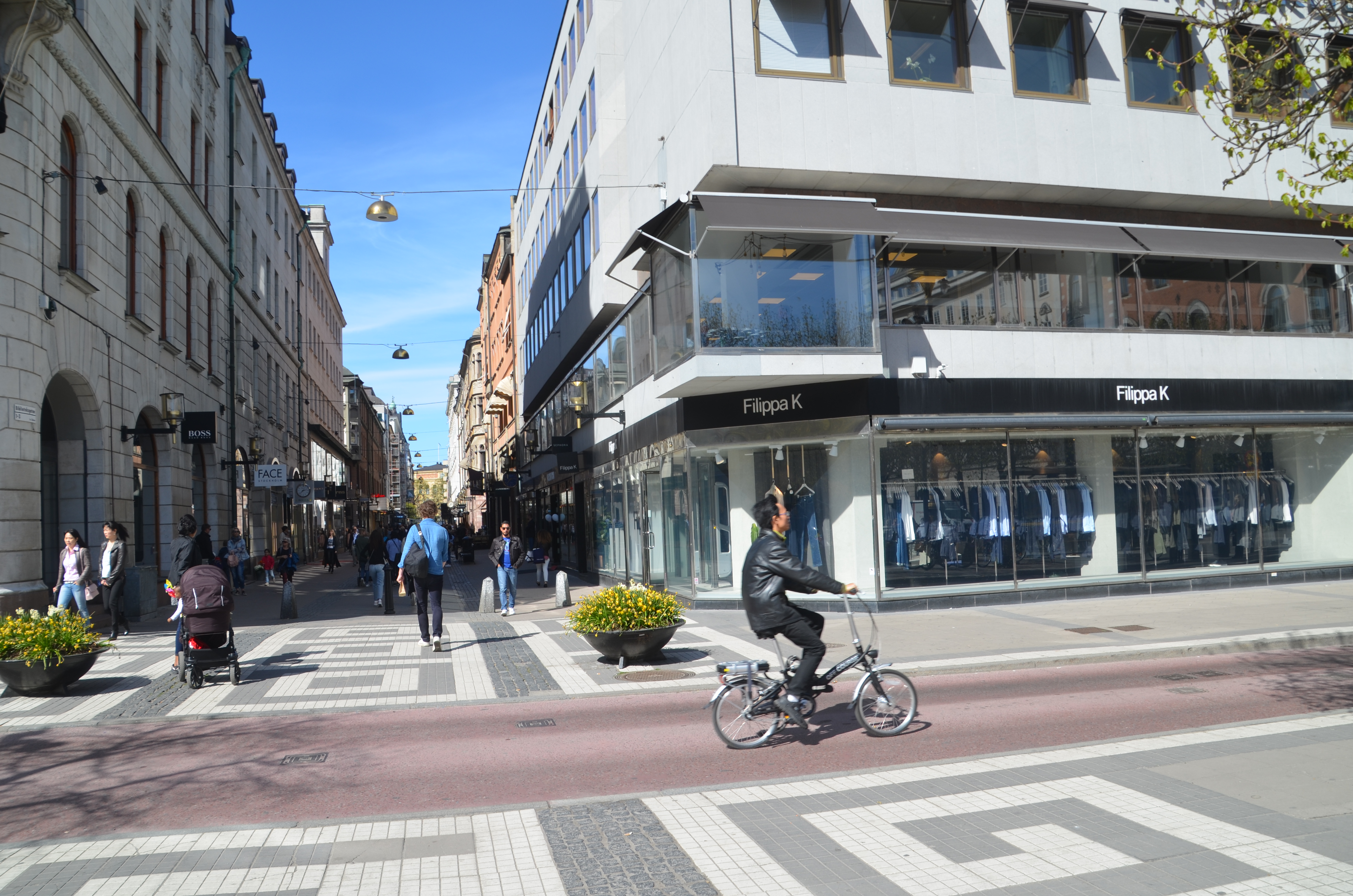 На углу магазин Hennes & Mauritz, где можно купить почты всё, что необходимо в вашем гардеробе, в том числе косметику и украшения. Слева очередной магазин в индийском стиле Indiska, предлагающий не только одежду, но и сумки, детали интерьера, подсвечники и другие привлекательные вещички. С другой стороны улицы – магазин перчаток и сумок (Handskmakarn). Здесь найдутся перчатки и сумки, включая театральную сумочку и лайковые перчатки. Неподалёку находится магазин спортивных товаров Stadium, а на противоположной стороне улицы, в доме номер 57 расположен классический Buttericks. Здесь покупателям предложат «ужасающие маски» и «ужасные вещички», предметы для праздников, маски и карнавальные костюмы не только для детей, но и для взрослых.