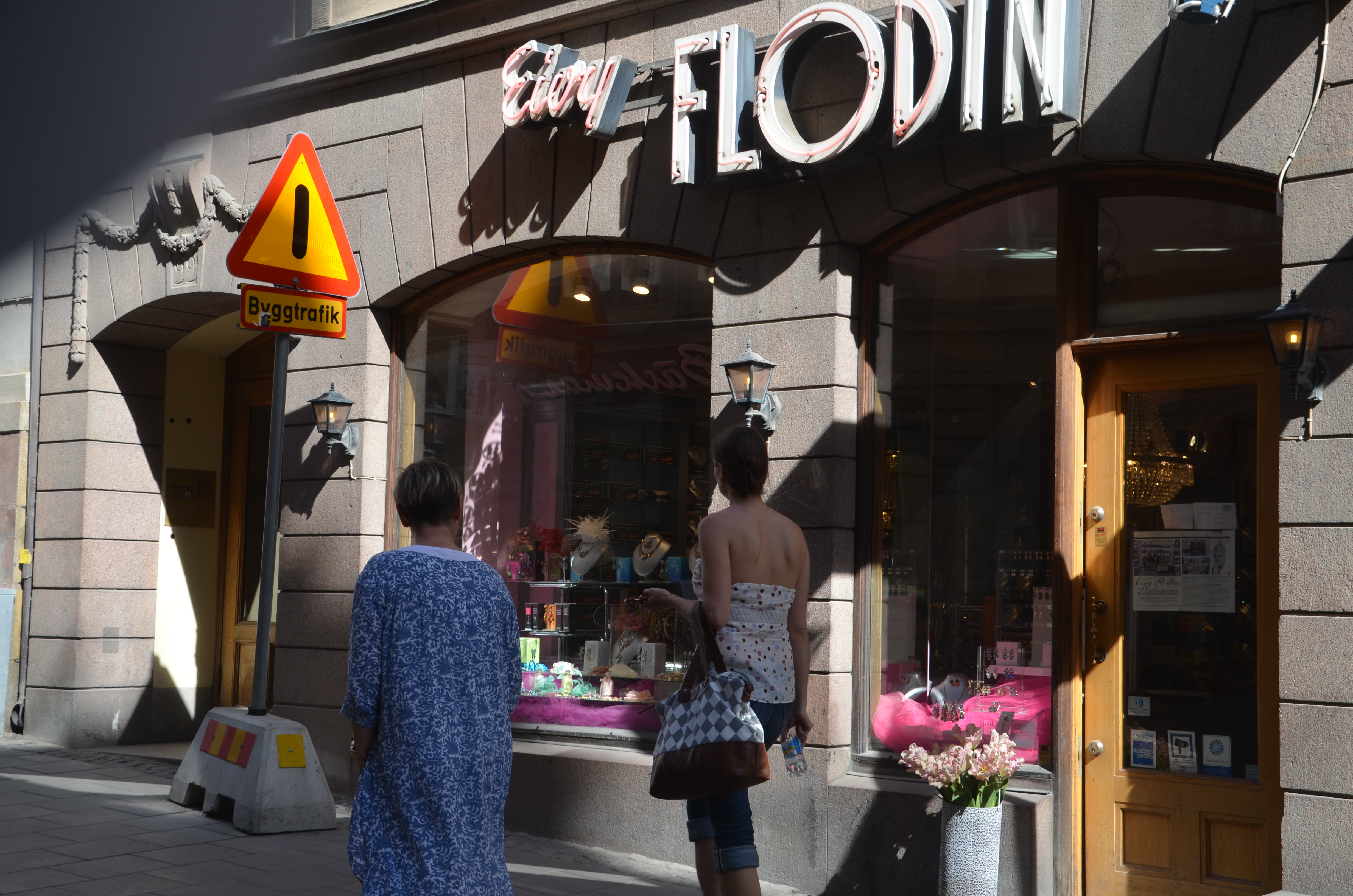 Рядом разместился старинный магазин модной парфюмерии и украшений Flodin. Здесь предложен самый широкий в городе ассортимент заколок и украшений для волос. Заколки для волос должны быть особенно обработаны, чтобы быть удобными в пользовании, большой выбор праздничных украшений, особенно серьги, клипсы и ожерелья, а также выбор старинных духов, например, Robert Picuet Fracas, которые кажется, невозможно купить в другом месте города. Этими духами в своё время пользовалась Грета Гарбо. Поинтересуйтесь Patchouli, типичными для 60-ых годов духами, сильно отличающимися от сегодняшнего ассортимента. Здесь можно купить и классические расчёски для волос от Mason Pearson, напоминающие те, которые вы ещё в детстве видели на трюмо своей бабушки. Правда, эти расчёски старинного стиля сегодня стоят довольно дорого и поэтому не «по карману» простому туристу. На спуске Nybogatan расположились картинные салоны и антиквариат и, наконец, рыночный павильон Эстермальм.