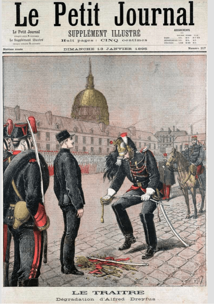 Pazemošanas un izsmiešanas tradīcijas visur ir apmēram vienādas. Tās ir teatrālas un pompozas pozas un nežēlīgi sadisma mehānismi. Šajā gadījumā viss sākās militārās augstskolas kazarmu pagalmā Parīzē. Tika izveidots speciālais „ soda gaitenis“ no karavīriem, kas šī mērķa dēļ tika izsaukti uz galvaspilsētu virsnieka Dreifusa publiskai eksekūcijai. Aiz skolas žoga pūlis kliedza lozungus: „nodevējs“, „maita“, „riebeklis“ un kāds virsnieks norāva no Dreifusa mundiera pogas un apbalvojumus. Kolēģi virsnieki skandēja tekstus: „Pamēģini tagad pateikt, ka esi nevainīgs!“, „nodevējs“, „Jūda!“ Pēc tam kāds cits publiski salauza viņa zobenu. Tātad nesimpātiskās personās iznīcināšana sākas klusi ar koridora sarunām, bet publiskajā telpā izvēršas tieši tāpat kā klasiskas grieķu traģēdijā: ar zalvēm kauna staba manifestācijai. Pēc tam upuri nosūtīja pilnai soda izciešanai uz Velna salu Dienvidamerikā, Franču Gvijānā. Alfreds tur pavadīja piecus gadus. Par ko?