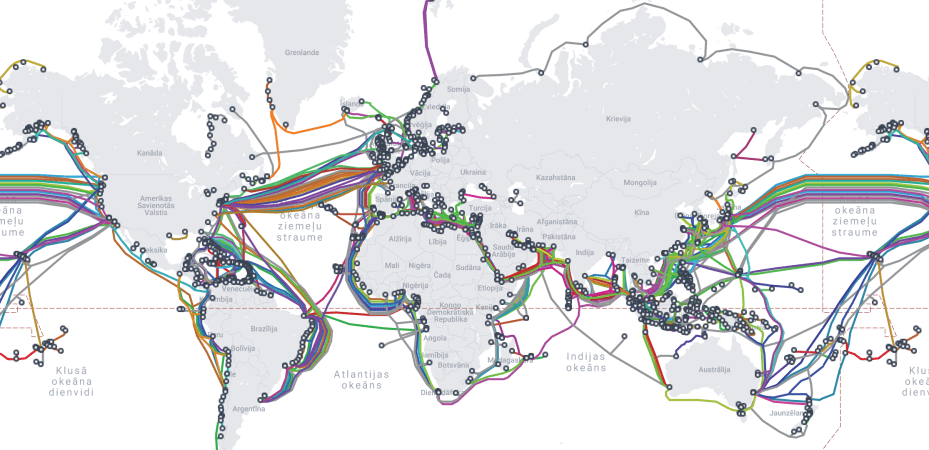 Papētot šo karti, var redzēt krāsainas „tauvas“, kas stiepjas cauri pelēkām, neuzkrītošām pasaules daļām, savienojot kontinentus un valstis ar apmēram 4000 kabeļiem, kas iezīmēti dažādās krāsās. Tātad – starptautisko komunikāciju nodrošina ne tikai satelīti, bet galvenokārt (95%) – kabeļi. Jo labāki kabeļi, jo straujāk pārvietojas informācija. Latviju pa jūras dibenu ar Zviedriju savieno 2 kabeļi no Ventspils, viens Latvija – Sweden 1 (LV-SE1) (Ventspils -Nīneshamna) – 304 km, kas darbojas kopš 1994.gada. Tā īpašnieki Tele2, Telecom Italia Sparkle, Telia Carrier, Tet. Otrs kabelis Sweden – Latvia kopš 2005.gada, 391 km, kura īpašnieki ir Latvijas valsts radio un televīzijas centrs (Ventspils-Farosunda-Stokholma). Vai kāds šo satiksmi izspiego un nodod informāciju naidīgai varai? Droši vien, jo pavisam nesen zviedru datus amerikāņiem spiegoja dāņi, izmantojot zemūdens kabeli Ēresunda šaurumā. Par to, ka šis spiegošanas un datu zagšanas lietas notiek ikdienas, mums 2013. gadā publiski paziņoja Eduards Snoudens. Dāvids Lindāls no Zviedrijas Aizsardzības institūta uzskata, ka Snoudena atmaskojumi bija satriecoši, jo pierādīja, ka visi noklausās visus. Ieskaidrot sabiedrotos un it kā draugus. Tas nozīmē, ka „lielās valstis“, kas izvieto šos „vadus“ jūras dzelmē un piedāvā pakalpojumus pārējiem, tur savā kontrolē visu pārsūtāmo informāciju. Snaudena atmaskojumu dēļ mazās jeb neitrālās valstis sāk veidot savus kabeļus, lai visa informācijas plūsma netiktu zibenīgi kopēta un izmantota citu valstu spiegošanas sistēmas vajadzībām.