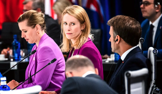 Attēlā (DPA): Dānija spremjerministre Mete Fredriksena, Igaunijas premjerministre Kaja Kallasa un Francijas prezidents Emanuels Makrons Madridē