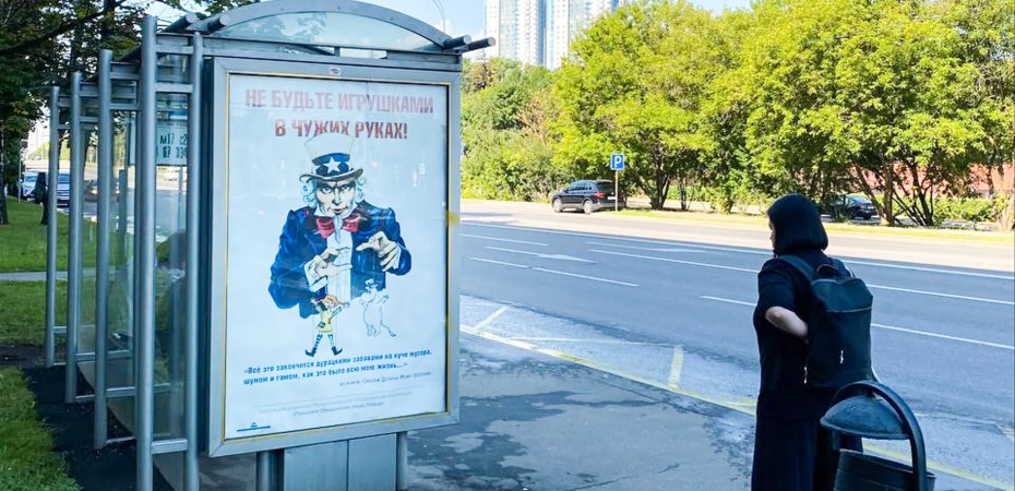 „Nekļūsti par rotaļlietu svešās rokās!“, – brīdina plakāts un kā „leļļu dresētājs“ tiek izmantots tēls, kuru tautā sauc par tēvoci Semu (Uncle Sam) un tas nozīmē amerikāņus. Šo tēlu kādreiz aģitācijas kampaņās plaši izmantoja PSRS laikā un tas tiek darīts tagad Krievijā no jauna.