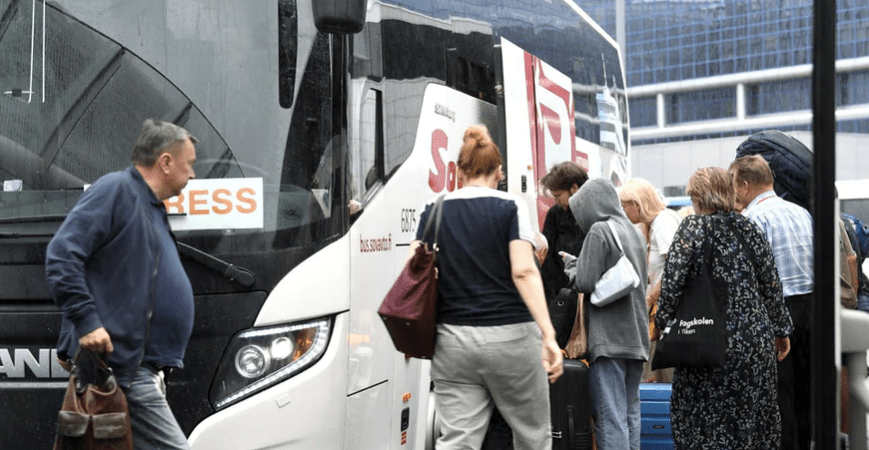 Attēlā igauņu autobusi, kas transportē krievus uz Helsinkiem