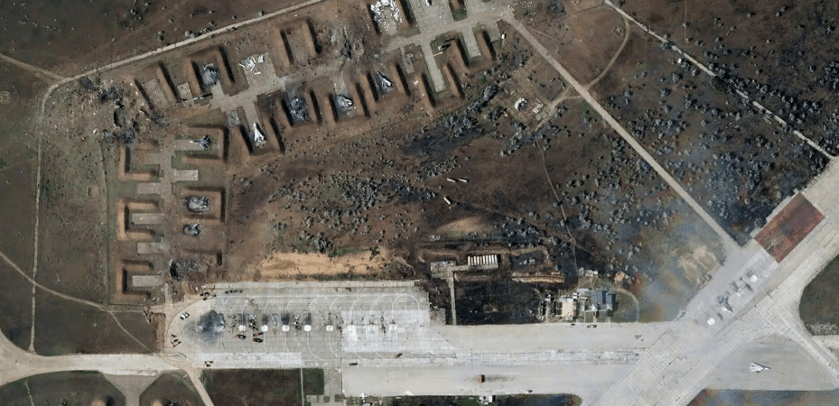 Sprādzieni Krimas karabāzē labi apskatāmi šajā attēlā. Izskatās, ka vismaz 8 krievu lidmašīnas pagalam. Krievu mediji apgalvo, ka nekā „tāda“ nav. Nekas nav saspridzināts, viss lieliski! Ukraiņi ziņo, ka munīcijas noliktava uzspridzināta un deviņas lidmašīnas arī. Nē, Kremlim tā neliekas. Tās esot vietējas nozīmes neveiksmes, nekā traģiska. Nekas nav noticis.