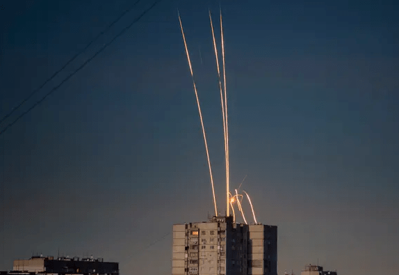 Attēlā krievu raķetes tiek šautas no Belgorodas, lai sagrautu Harkovu