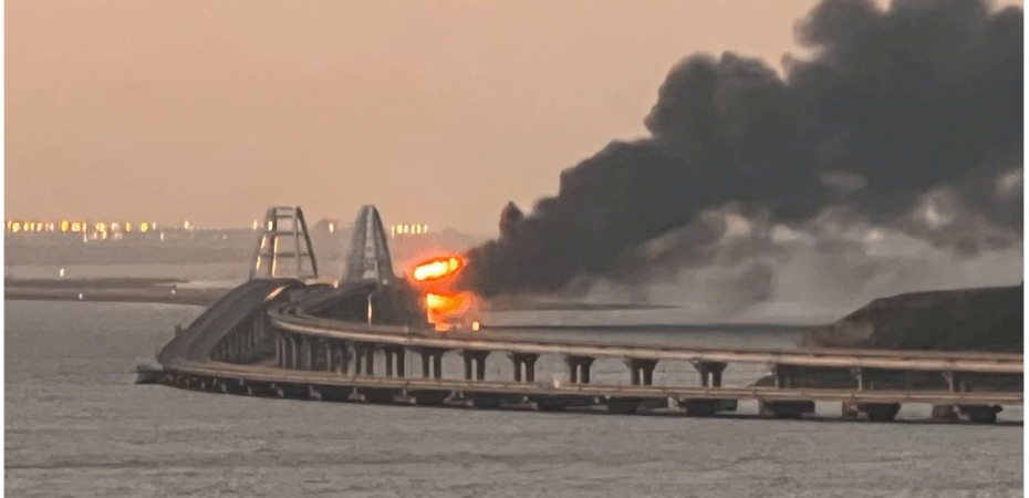Tātad sestdien sešos no rīta (pēc vietējā laika) notika eksplozija uz tilta, kas savieno Krimu ar Krieviju. Šis tilts tika būvēts pēc okupācijas (2014) un tiek uzskatīts par Putina „prestiža projektu“. Tiek izvirzītas vairākas versijas par to, kurš šo eksploziju sarīkojis. Vai tā bija raķete no Ukrainas, vai laiva ar sprāgstvielām, vai tomēr bumba smagajā automašīnā. FSB žigli piedāvāja versiju par vainīgo automašīnu, kurā sprāgstvielas esot bijušas satītas plēvē, ar kopējo svaru 22 770 kg. Dramatisks videoieraksts rāda kādu smago automašīnu, kura pabrauc garām novērošanas kamerām. Pēc tam sprādziens un tilta posms uziet gaisā.