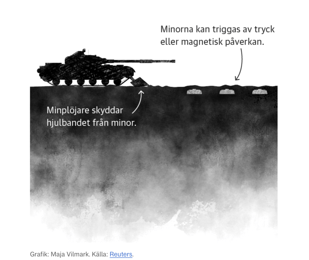 Parasti mīnas ir ieraktas tā, ka zemes virspusē redzams tikai maza daļa no šī bīstamā ieroča. Tās nevar pamanīt un nevar vienmēr redzēt ar dronu. Tās sprāgst, tikai pārbraucot pāri.