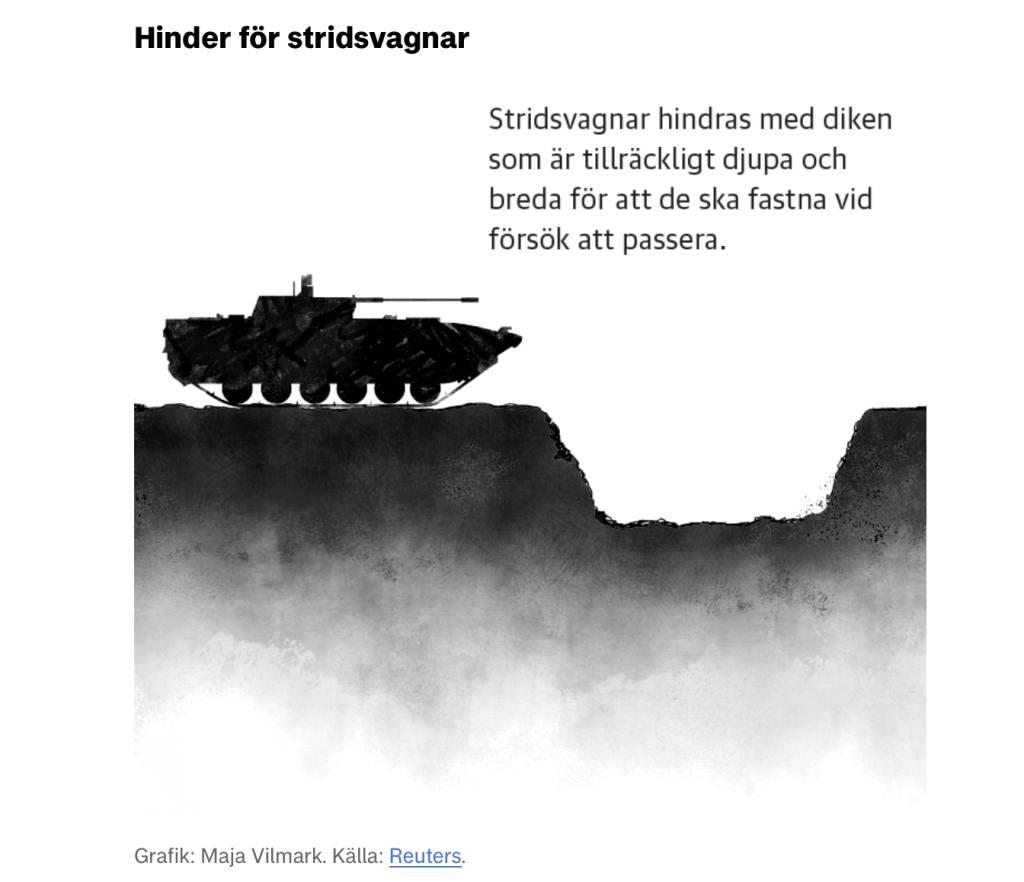 No oktobra līdz jūnijam ukraiņi gaidīja ieročus no rietumiem. Tikmēr krievu karavīri un ukraiņu gūstekņi raka grāvjus un vilka dzeloņstieples krievu aizsardzībai. Šī sistēma sastāv no vairākiem posmiem. Kāpēc tā? „Tāpēc, lai neatļautu ienaidniekam pārvietoties vairākos virzienos. Tātad – izveido lamatas un dzen savu pretinieku uz šīm lamatām“, – skaidro Juhans Hoivinens. Tāpēc arī šis krievu aizsardzības sistēma šādi i izveidota un izskatās nepārvarama.