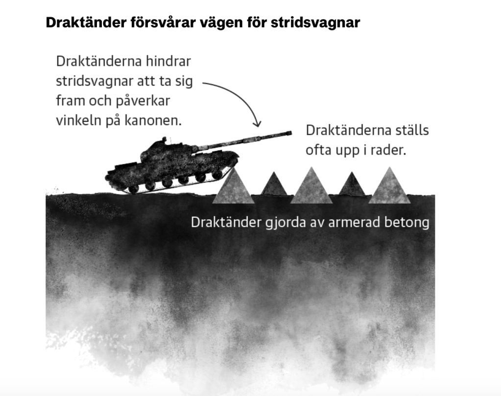 Nākamais attēls : „pūķa zobi“. Šie betona trīsstūri/piramīdas traucē tankam braukt tālāk un panāk, ka lielgabals šauj gaisā. Tos veido no betona un saliek rindās. Tie traucē mazākus tankus, lielie tos sašķaida un brauc pāri. Slikti, ka tie liek tankam apstāties un tāpēc tas kļūst par ērtu mērķi pretiniekam.