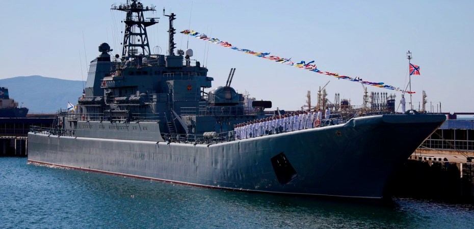 Attēlā viens on krievu kuģiem (Gornjak), kas tika bojāts ukraiņu uzbrukuma rezultātā (DN)