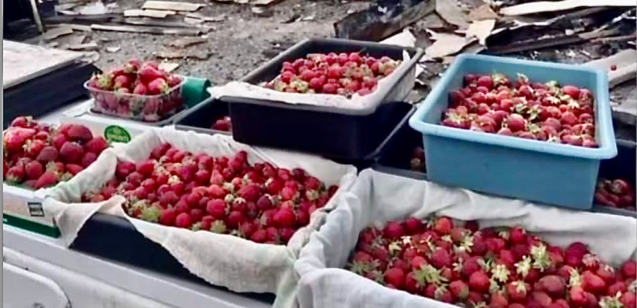 Zemeņu laiks ir klāt arī ukraiņiem. Saldās ogas pārdod un dala starp drupām un māju gruvešiem. Pilsētās, kur vēl atrodami iedzīvotāji. (DN)