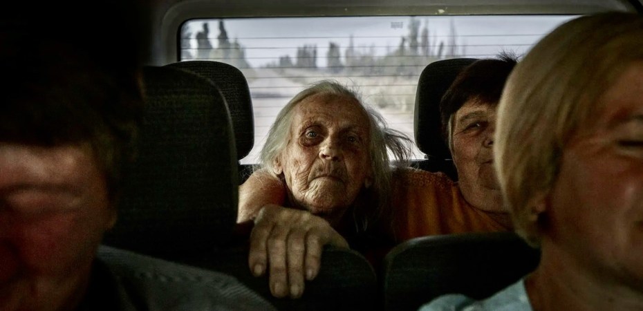 Attēlā evakuācija no Budas ciema Ukrainā.