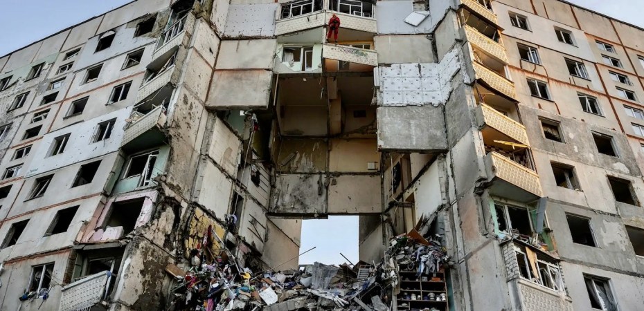 Padomju laika betona ēka tagad izskatās kā milzīga leļļu māja, kas ieradusies Harkivā tieši no elles. Pieci stāvi ēkas centrā ir sabrukuši. Dīvāni, drēbes, katli un pannas, ledusskapji un elektriskie sildītāji no dzīvokļiem vairākos stāvos tagad sakrituši gigantiskā kaudzē.