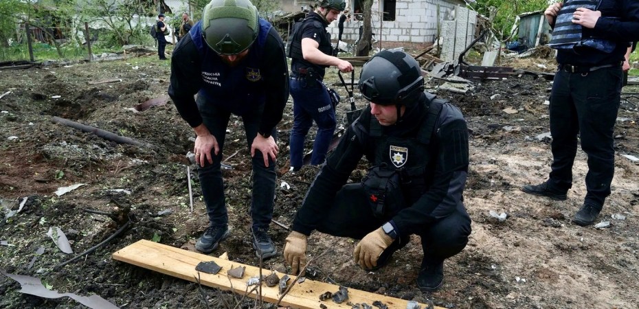 Attēlā: ukraiņu policija un prokuratūra izmeklē slīdošo bumbu uzbrukuma sekas privātmāju rajonā, pie Harkivas (AP)