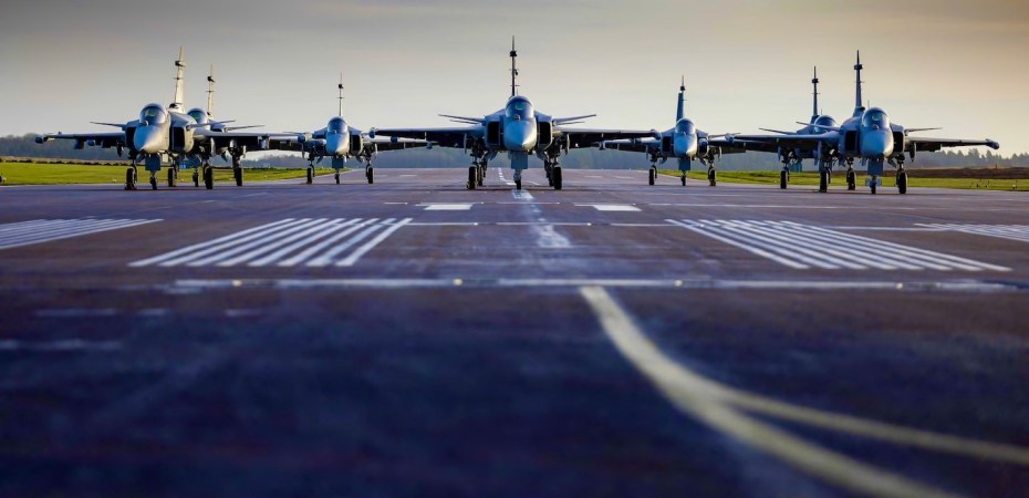 Attēlā – astoņi Gripen E pirms pacelšanās (SAAB)