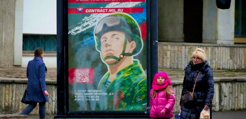 Komentārs attēlam: Līguma dienests armijā. Teksts uz plakāta Pēterburgā. Šādi Krievijas varas iestādes cenšas piesaistīt jaunus karavīrus Ukrainas frontei. Foto: AP