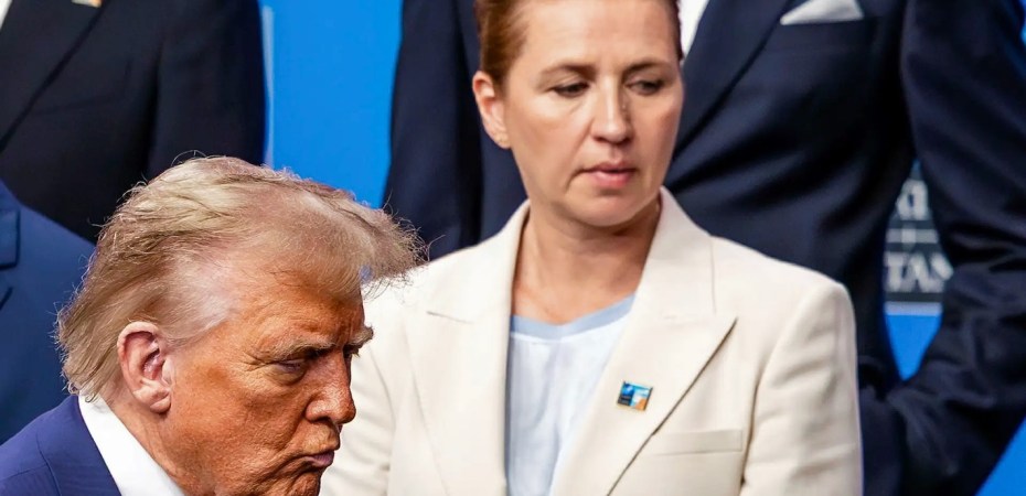 Ilustrācija: ASV prezidents Donalds Tramps un Dānijas premjerministre Mete Frederiksena NATO samitā Hāgā šovasar. Foto: Gerts Vandens Vijngāerts/AP