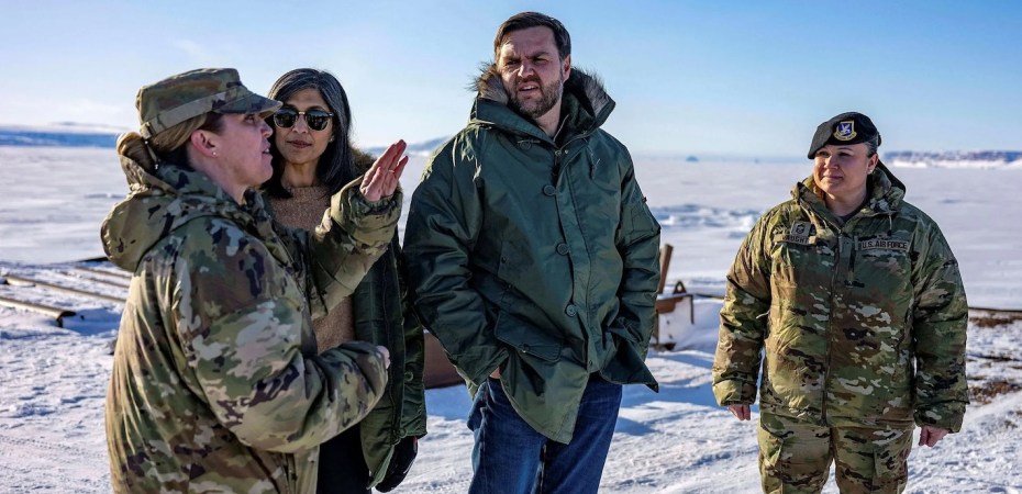 Attēlā ASV viceprezidents Dž. D. Venss ASV militārajā bāzē Pitufikas kosmosa bāzē Grenlandē, 2025. gada 28. martā. Pēc vairāku ekspertu domām, trūkst ekonomisku un militāru argumentu, lai ASV pārņemtu Grenlandi. Taču Trampa cilvēki Baltā nama tā nedomā. Foto: Džims Vatsons/AP