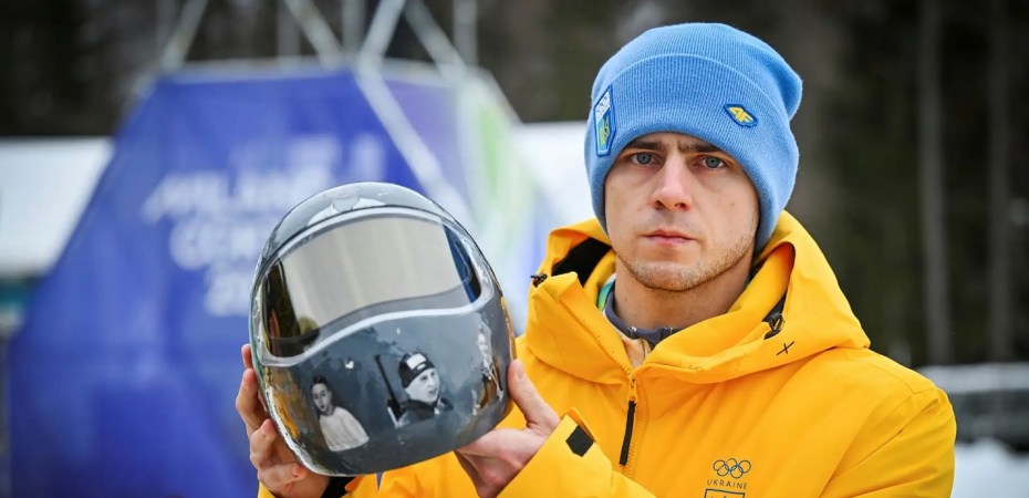 Ilustrācija: Ukrainas skeletonists Vladislavs Heraškevičs tiek sodīts. Viņu diskvalificē par to, ka viņš atsacījās noņemt savu ķiveru, kas rotāta ar kara upuriem – ukraiņus sportistiem . Foto: Roberts Maikls