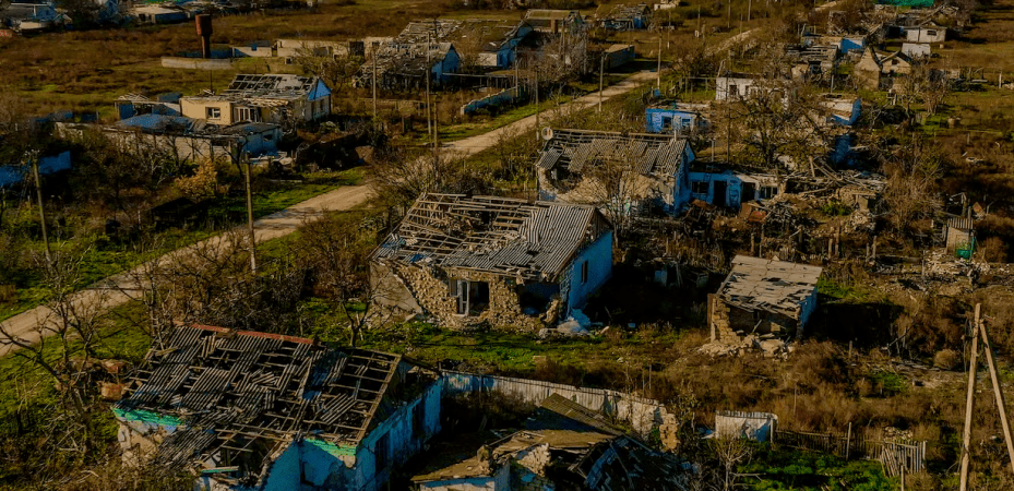 Attēlā – krievu sagrautais Posadas-Pokrovskas ciems, netālu no Hersonas. Alessio Mamo/The Observer