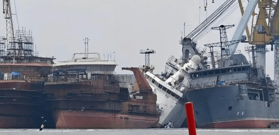 Pēdējo nedēļu laikā ukraiņi aktīvi uzbrūk krievu kuģiem, bāzēm un noliktavām Baltijās jūrā. Tāpēc aizvakar un vakar tika iznīcināts militārais ledlauzis, kas bija pietauvojies Viborgas jūras bāzē. Attēlā varat apskatīt milzīgo sānsveri jaunajam krievu kuģim, kuru ukraiņi sabojājuši. Blakus esošie kuģi to balsta. Ledlauzi, kas identificēts kā “Purga”, esot izmantojis Krievijas militārās izlūkošanas dienests FSB. Līdz šim neviens krievu militārais kuģis Baltijas jūrā nebija šādi “traumēts”. “Purga” ir ledus klases robežapsardzes kuģis, kas būvēts Krievijas Federācijas Federālā drošības dienesta Robežsardzes Krasta apsardzei. Tas paredzēts arktikas ūdeņu aizsardzībai, spēj pārlauzt ledu līdz 1,7 metru biezumā un ir bruņots ar artilērijas stiprinājumiem, ložmetējiem un helikopteru angāriem.