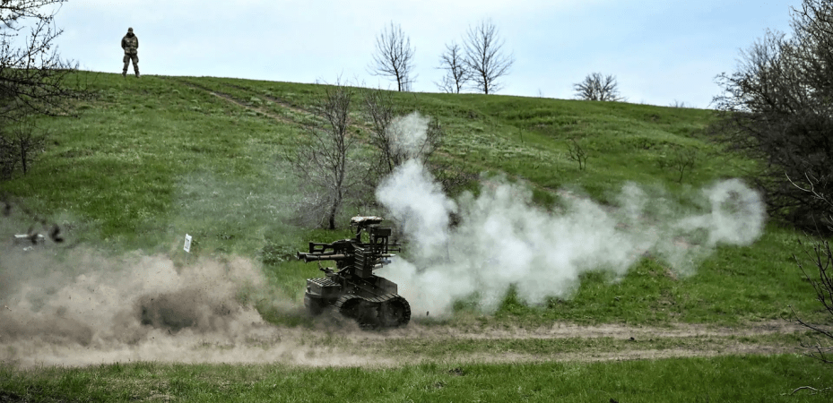 Ilustrācija: tālvadības roboti tiek izmantoti gan gaisā, gan uz zemes. Attēlā redzams kāpurķēžu robots, kas aprīkots ar ložmetēju. Foto: Dmitro Smolienko/TT